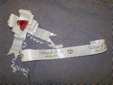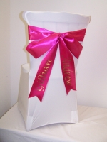 100mm wide satin finish ribbon printed with the names of the happy couple at each end. These add a touch of luxury to your special day when combined with our chair covers and matching event decor.